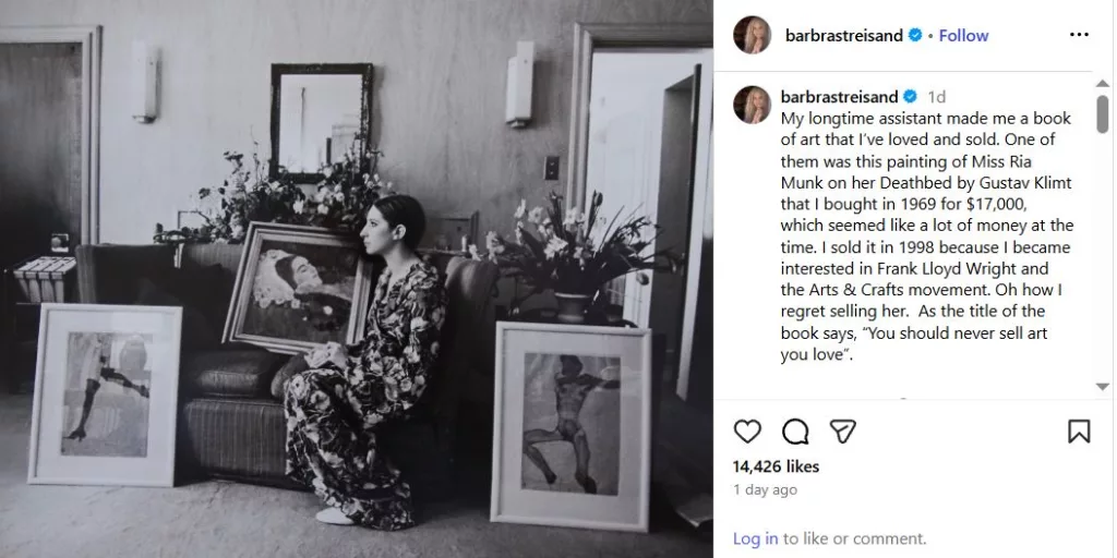 Në një postim në profilin e saj në Instagram, Barbara tregoi se asistenti i saj i vjetër i kishte përgatitur një album me veprat e artit që ajo kishte dashur dhe më pas kishte shitur. Mes tyre ishte edhe “Miss Ria Munk on her Deathbed”, një pikturë që ajo e kishte blerë në vitin 1969 për 17.000 dollarë, një shumë që asokohe i ishte dukur tejet e lartë.