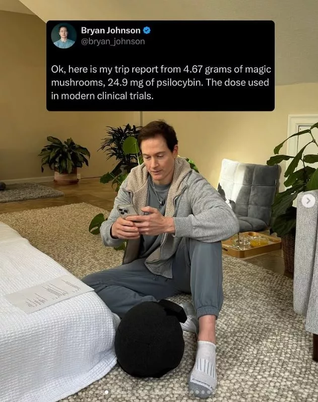 Miliarderi amerikan Bryan Johnson, i njohur për projektin e tij ambicioz “Blueprint”, ka kryer së fundmi një eksperiment të ri të diskutueshëm: konsumimin e 4.67 gramëve kërpudha të thata që përmbanin rreth 24.9 mg psilocibinë, që është substanca psikoaktive përgjegjëse për efektet haluçinogjene të kërpudhave “magjike” dhe ndërveprimin e saj me receptorët e serotoninës në tru.
