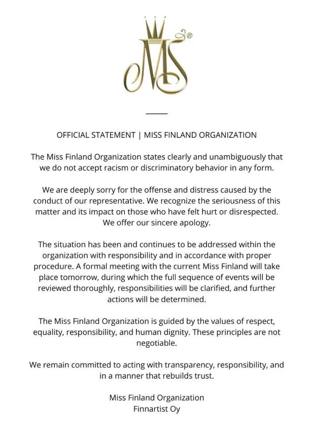 “E kuptoj shumë mirë që veprimet e mia kanë shkaktuar ndjesi të keqe dhe më vjen shumë keq për këtë. Titulli Miss Suomi (Miss Finlanda) nuk është thjesht një kurorë për mua, por gjithashtu një përgjegjësi.” – ka shkruar ajo.