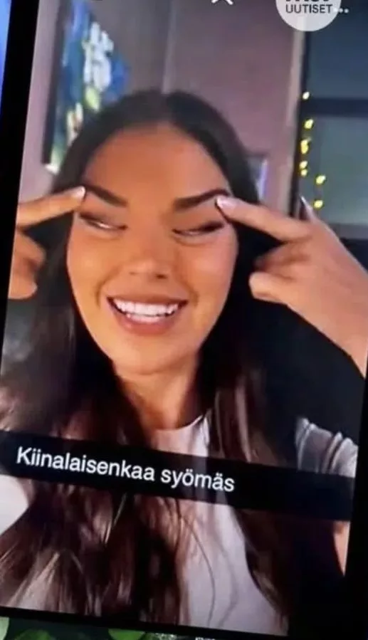 “Duke ngrënë me një kinez!” – ka shkruar poshtë fotos 22-vjeçarja e lindur nga një nënë finlandeze dhe me baba nga Kosova. Flitet se fillimisht ajo është përpjekur ta justifikojë gjestin duke thënë se ka tërhequr fytyrën pasi kishte dhimbje të forta koke, por më vonë ka kërkuar falje.