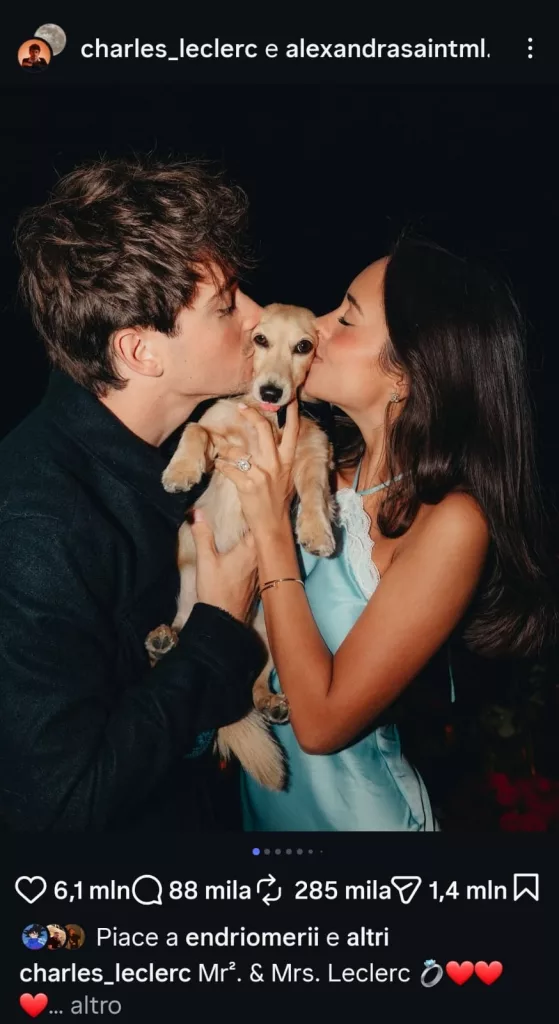 Detaji interesant që nuk mund të lihet pa u vënë re, është se Leclerc ka përdorur qenushin e tij Leo për t’i bërë propozimin Alexandrës, në varësen e të cilit ka shkruar: Babi do që të martohet me ty!