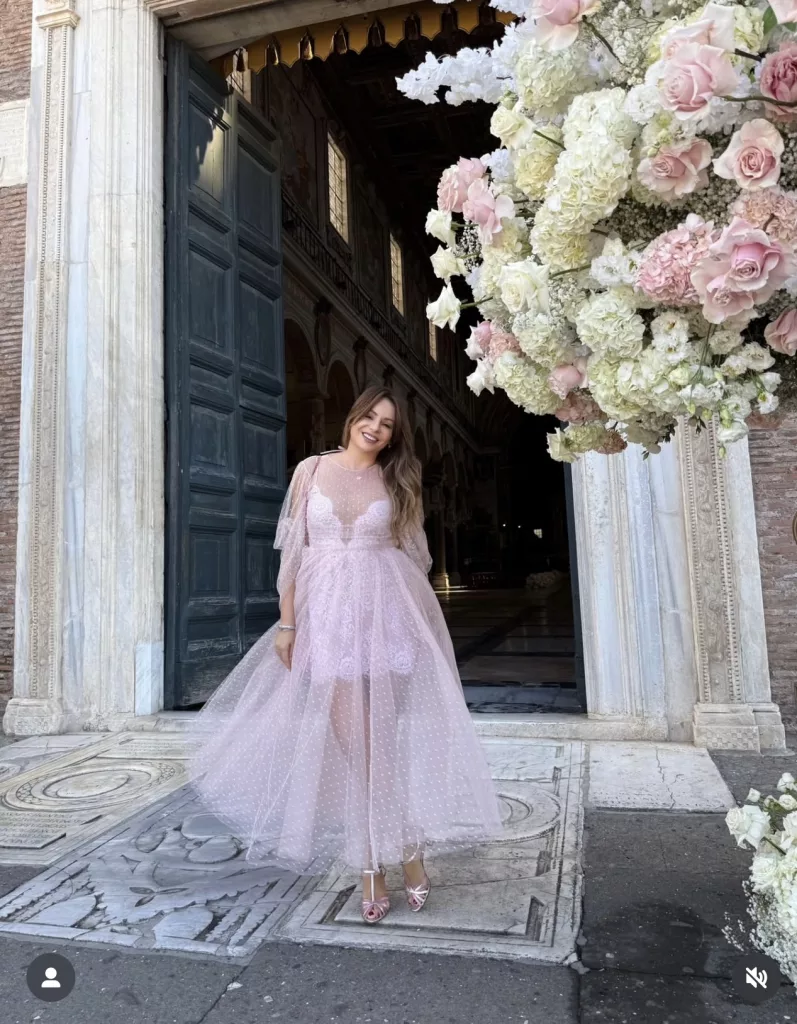 Është e vështirë të kapësh në gabim drejtuesen e “Geraldina Sposa”, Marçela Lati. Ajo duket shumë elegante me këtë fustan ngjyrë pastel të cilin e ka veshur në ceremoninë e kishës.